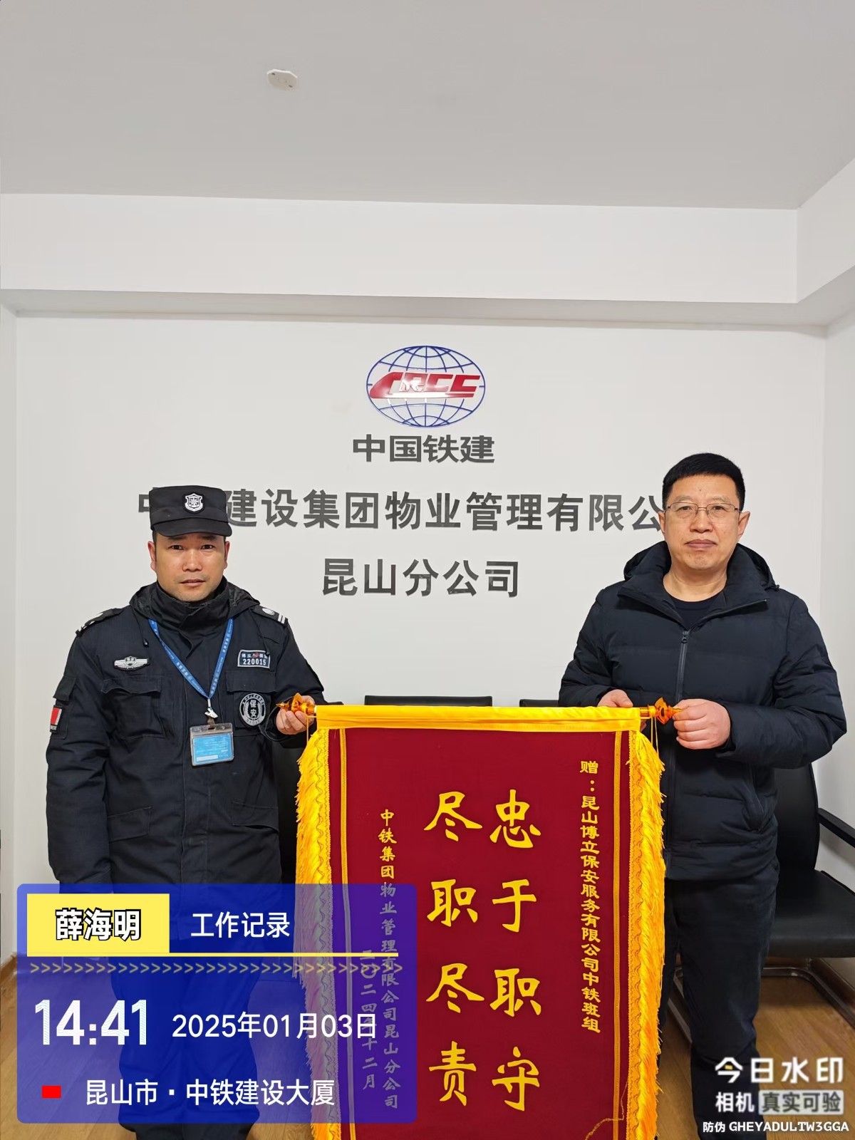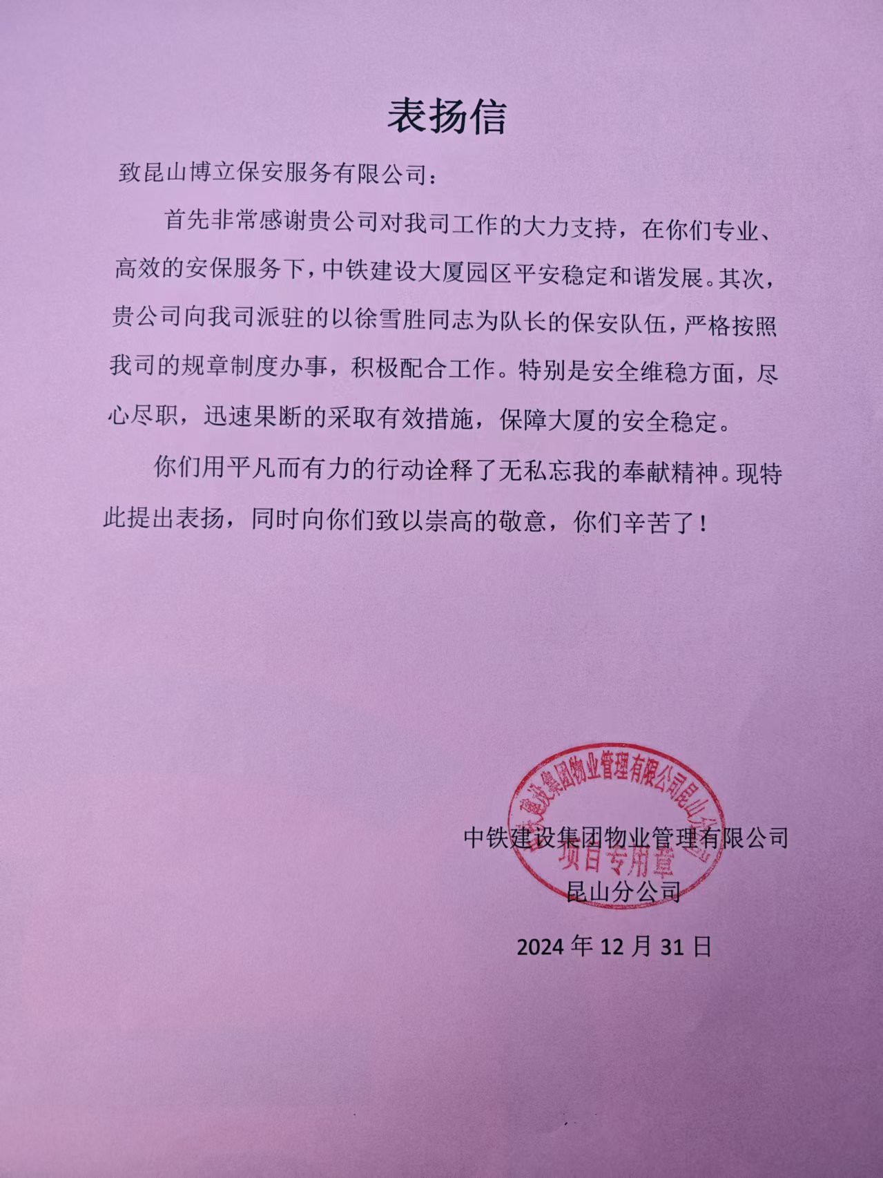 2025年1月3日,中铁建设集团昆山分公司送来锦旗一面和表扬信一封,表彰昆山博立保安服务公司驻点保安队长徐雪胜,带领全体保安员严格按照规章制度办事,积极配合中铁分公司做好日常交办工作。特别是安全维稳方面,尽心尽责,技能专业,遇到突发情况,迅速果断采取有效措施,保障公司安全稳定。表扬博立保安无私忘我的奉献精神,向博立保安致以崇高的敬意!